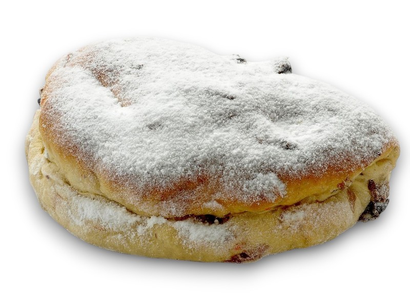Mini stol gevuld met amandelspijs en rozijnen.