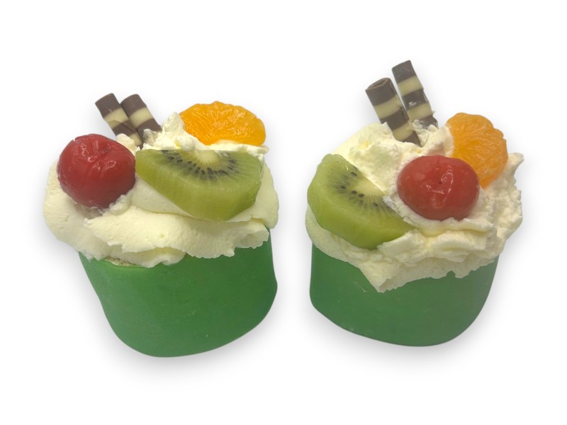 Kapsel gevuld met chipolata vulling. Gedecoreerd met slagroom, chocolade en vers fruit.