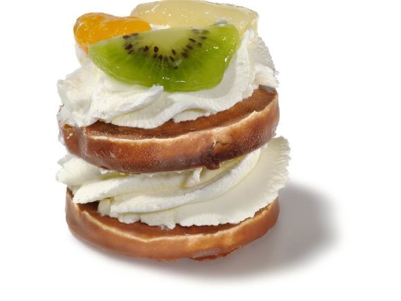 Schuimplakjes omhuld met chocolade en gevuld met slagroom. Bovenop gedecoreerd met vers fruit.