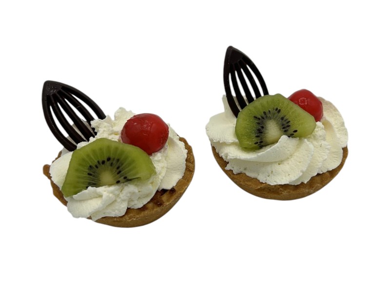 Wenerbodem gevuld met amandelspijs en gedecoreerd met slagroom, chocolade en vers fruit.