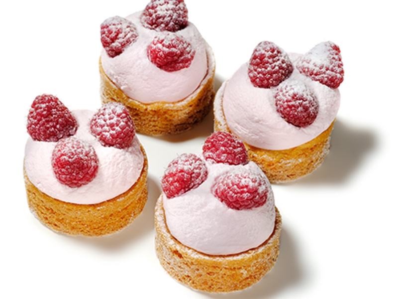 Roomboter amandelbodem gevuld met frambozenbavaroise en verse framboos.