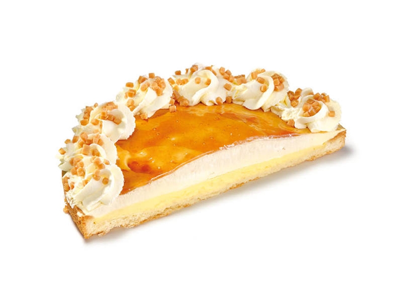Traditionele vlaaibodem gevuld met een luchtige caramel bavarois. Afgewerkt met een heerlijke caramel laag en een rand slagroom.