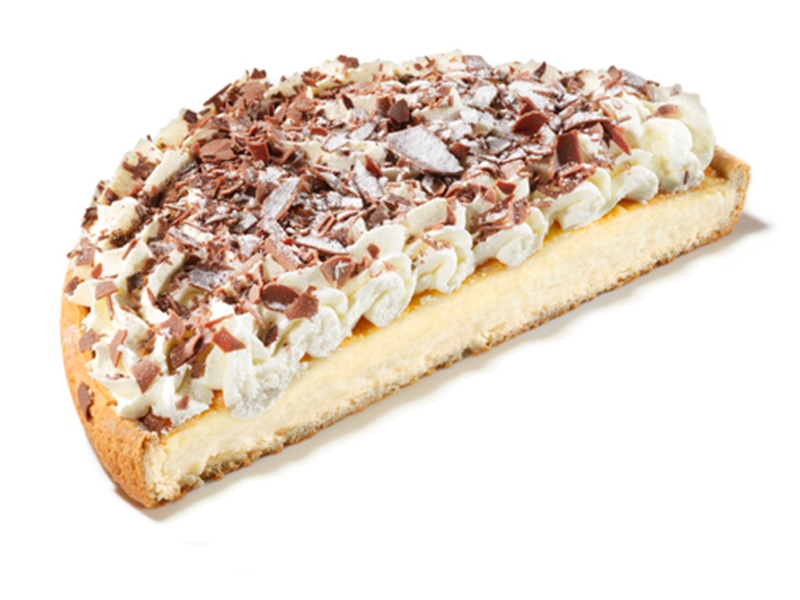 Traditionele vlaaibodem rijkelijk gevuld met rijstepap, royaal opgespoten met slagroom en afgewerkt met chocoladeschaafsel.